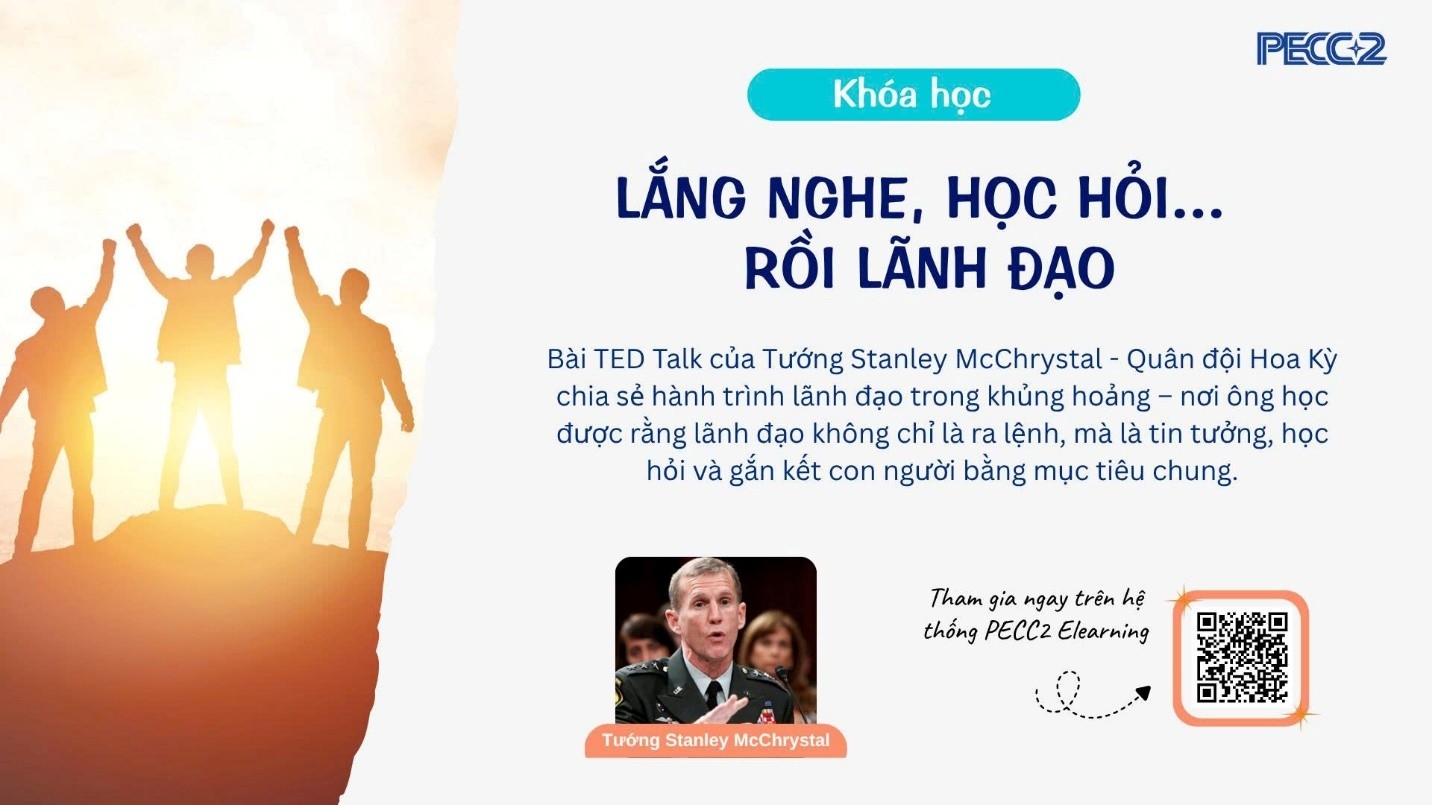 Những chia sẻ của Tướng McChrystal không chỉ đúng trong quân đội mà còn vô cùng thiết thực cho môi trường doanh nghiệp hiện đại. Anh Chị quan tâm hãy truy cập hệ thống PECC2 E-Learning và tìm kiếm từ khóa “Lắng nghe, học hỏi rồi lãnh đạo” hoặc nhấn vào đây: http://elearning.pecc2.com/enrol/index.php?id=638 để tham tham gia khóa học ngay.