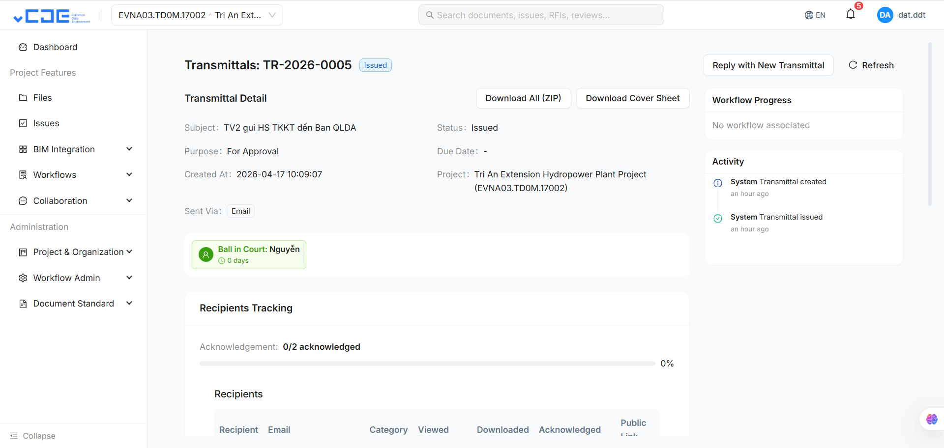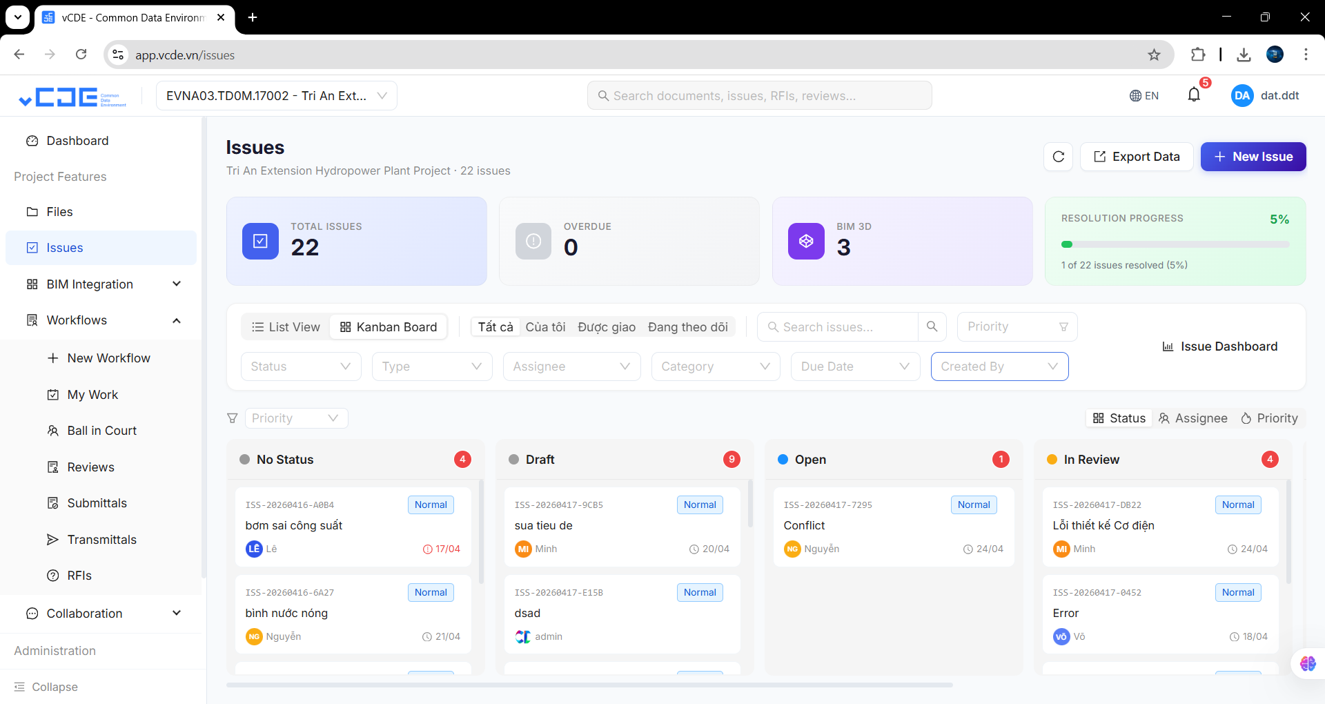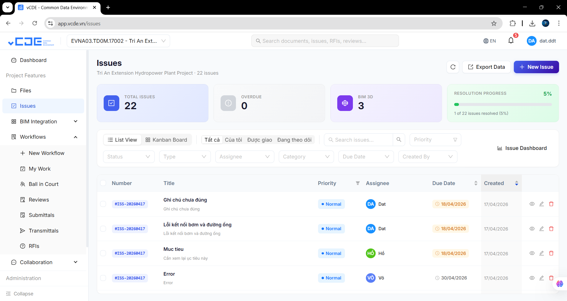 Phiên thứ hai đi sâu vào ứng dụng CDE trong quản lý dự án hằng ngày, với các nội dung như quản lý Issue, RFI trực tiếp trên mô hình 2D/3D; số hóa quy trình hồ sơ thông qua Transmittal, Submittal; tích hợp dấu stamp và chữ ký điện tử nhằm đảm bảo tính pháp lý. Hệ thống Dashboard cũng được sử dụng để theo dõi tiến độ, kiểm soát các chỉ số như Issue, RFI quá hạn và hỗ trợ xuất báo cáo tự động.