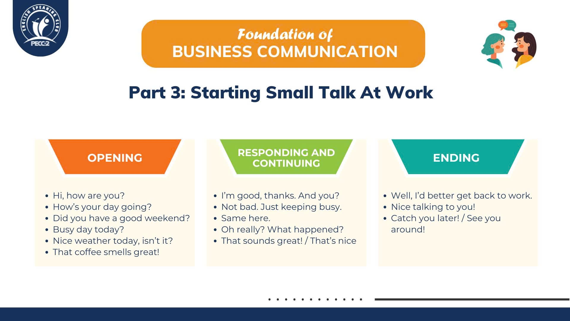 Với tinh thần đó, ngày 12/6, Câu lạc bộ tiếng Anh PECC2 đã tổ chức buổi sinh hoạt với chủ đề “Nghệ thuật bắt chuyện tại nơi làm việc”. Buổi sinh hoạt tập trung vào các mẫu câu tiếng Anh đơn giản, thiết thực nhằm giúp cán bộ nhân viên tự tin hơn trong việc khởi đầu các cuộc trò chuyện ngắn (small talk) nơi công sở.