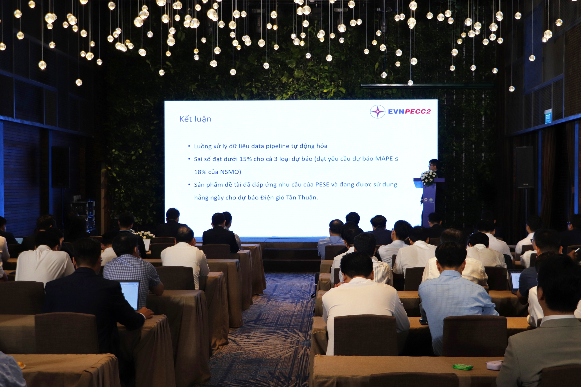 Tại sự kiện, PECC2 vinh dự tham gia trình bày trong Phân ban "Chuyển đổi số và Ứng dụng AI" với báo cáo khoa học: "Ứng dụng công nghệ AI vào dự báo công suất điện gió của Nhà máy Điện gió Tân Thuận", do anh Nguyễn Hữu Khoa Minh - Kỹ sư Trung tâm Năng lực Số (PECC2-DCC) trực tiếp trình bày.