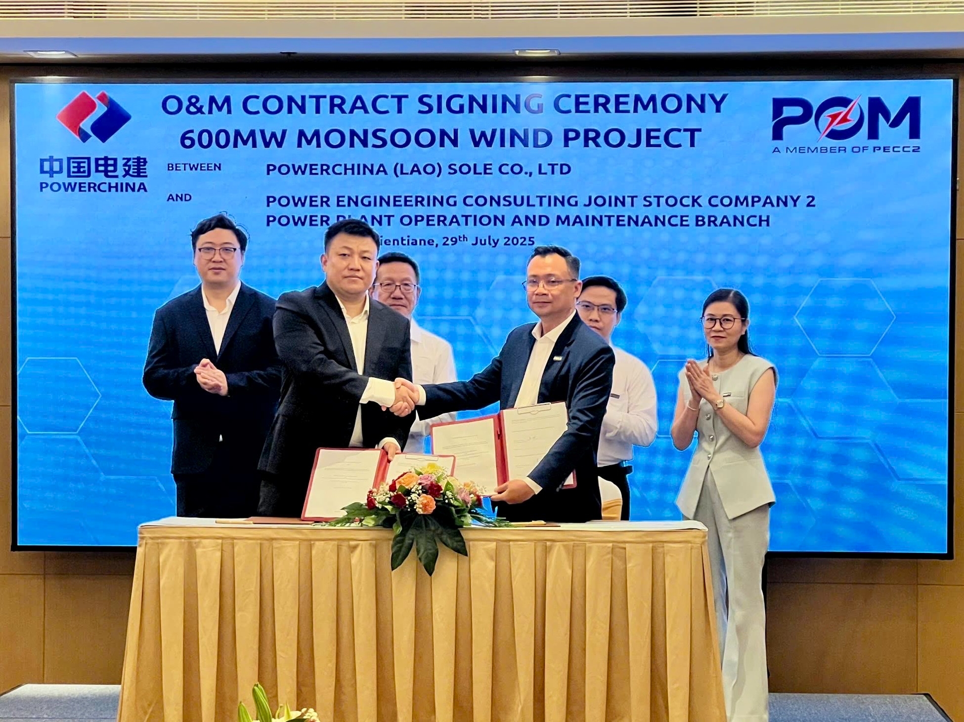 Chiều ngày 29/07/2025, tại thủ đô Viên Chăn (Lào), Công ty Cổ phần Tư vấn Xây dựng Điện 2 – Chi nhánh Vận hành và Bảo trì Nhà máy điện (POM) đã ký kết hợp đồng cung cấp dịch vụ vận hành Trạm biến áp 500kV & 110kV – Dự án Nhà máy điện gió Monsoon 600 MW với Công ty TNHH PowerChina Lào (POWERCHINA (LAO) SOLE CO., LTD).