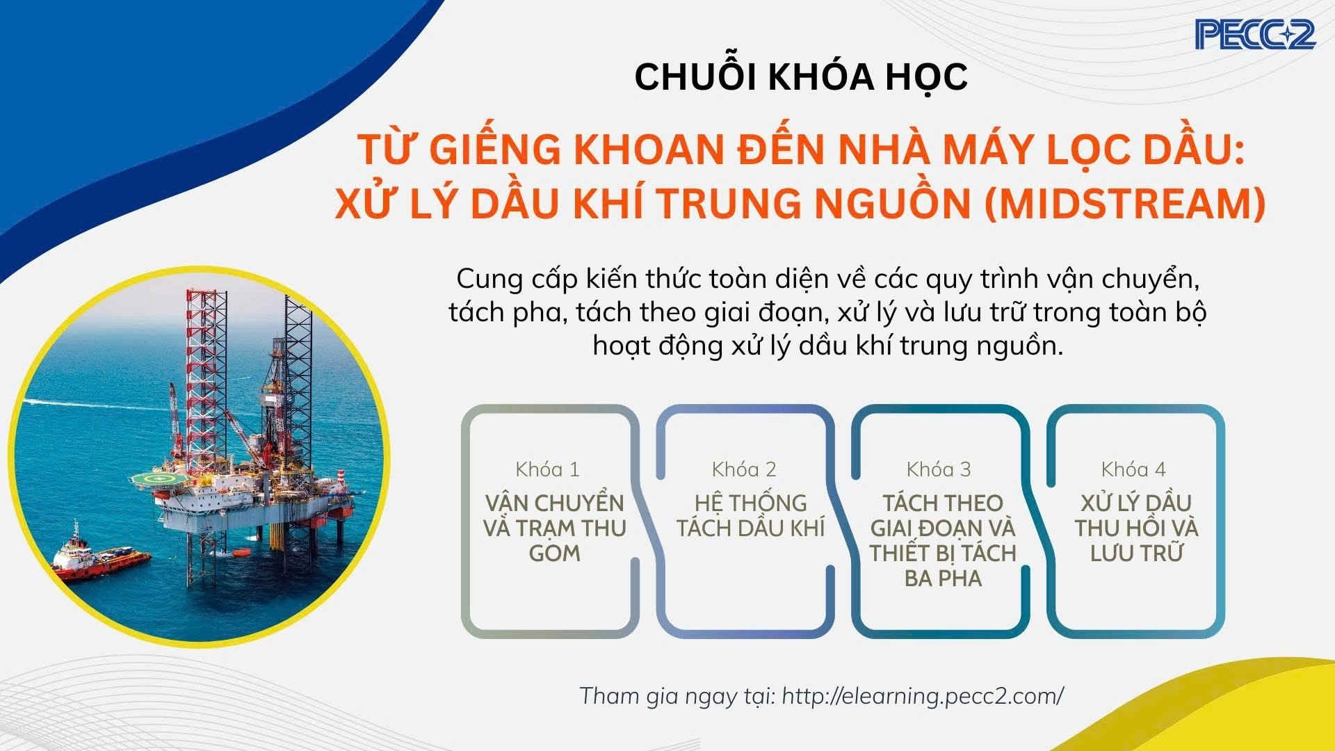 Trong ngành dầu khí, chu trình từ khai thác dầu khí ở giếng khoan đến xử lý, tinh chế thành sản phẩm cuối cùng là một quá trình phức tạp, đòi hỏi kiến thức chuyên sâu và kỹ năng thực tiễn. TR&D xin giới thiệu chuỗi khóa học trực tuyến “TỪ GIẾNG KHOAN ĐẾN NHÀ MÁY LỌC DẦU: XỬ LÝ DẦU KHÍ TRUNG NGUỒN (MIDSTREAM)” trên nền tảng PECC2 eLearning nhằm cung cấp cái nhìn tổng quan và chuyên sâu về các quy trình trung nguồn (midstream) trong ngành Dầu khí – mắt xích quan trọng nối giữa khai thác (upstream) và chế biến/phân phối (downstream) để các thành viên PECC2 quan tâm tham gia học tập.