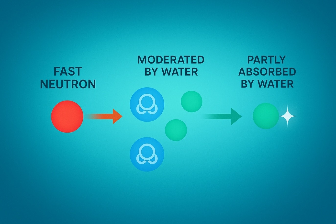 Làm chậm neutron (Moderation): Neutron sinh ra từ phản ứng phân hạch là neutron tức thời ( chiếm 99%) và neutron trễ. Neutron trễ (Delayed neutrons) có vai trò cực kỳ quan trọng trong việc kiểm soát an toàn và ổn định lò phản ứng hạt nhân, nhờ có neutron trễ, phản ứng phân hạch không diễn ra quá nhanh – giúp các thanh điều khiển (control rods) và hệ thống điều khiển kịp thời can thiệp. Đối với Neutron tức thời (có năng lượng ~ 2 MeV) để có thể gây phân hạch Uranium-235 một cách hiệu quả, chúng cần được làm chậm lại thành neutron nhiệt (năng lượng ~0.025 eV). Cơ chế chính để làm chậm neutron là thông qua tán xạ đàn hồi (elastic scattering) giữa neutron và các hạt nhân nhẹ như hydrogen (trong nước nhẹ). Do có khối lượng gần bằng neutron, nguyên tử Hydro khi va chạm đàn hồi sẽ hấp thụ phần lớn động năng của neutron. [1]